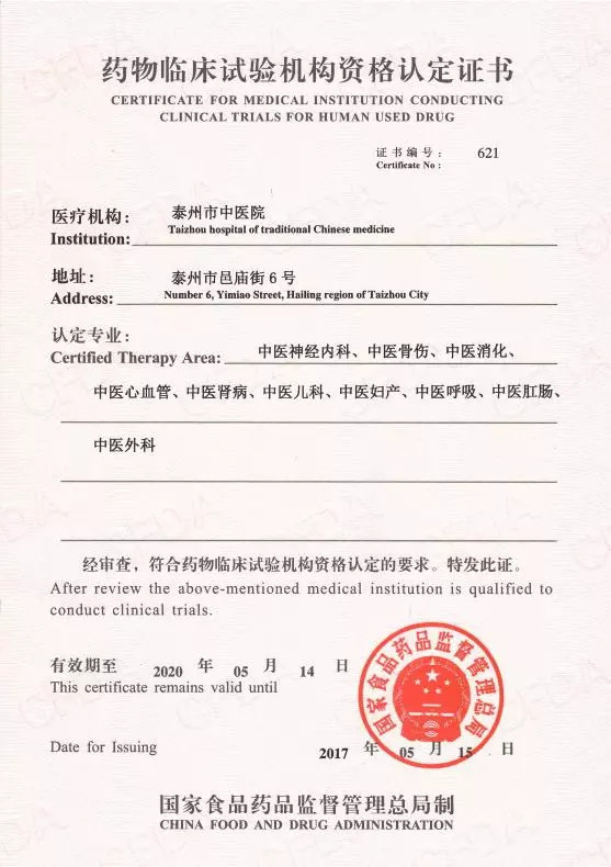 機(jī)構(gòu)于2014年01月完成國(guó)家藥物臨床試驗(yàn)機(jī)構(gòu)申報(bào),2017年03月12日~15日接受CFDA組織的現(xiàn)場(chǎng)檢查,2017年5月15日獲得國(guó)家“藥物臨床試驗(yàn)機(jī)構(gòu)資格認(rèn)定證書”。2018年10月,對(duì)14個(gè)臨床專業(yè)組(中醫(yī)神經(jīng)內(nèi)科、中醫(yī)骨傷、中醫(yī)消化、中醫(yī)心血管、中醫(yī)腎病、中醫(yī)兒科、中醫(yī)婦產(chǎn)、中醫(yī)呼吸、中醫(yī)肛腸、中醫(yī)外科、中醫(yī)腫瘤、中醫(yī)內(nèi)分泌、中醫(yī)老年科、醫(yī)學(xué)檢驗(yàn)科)進(jìn)行器械備案。
