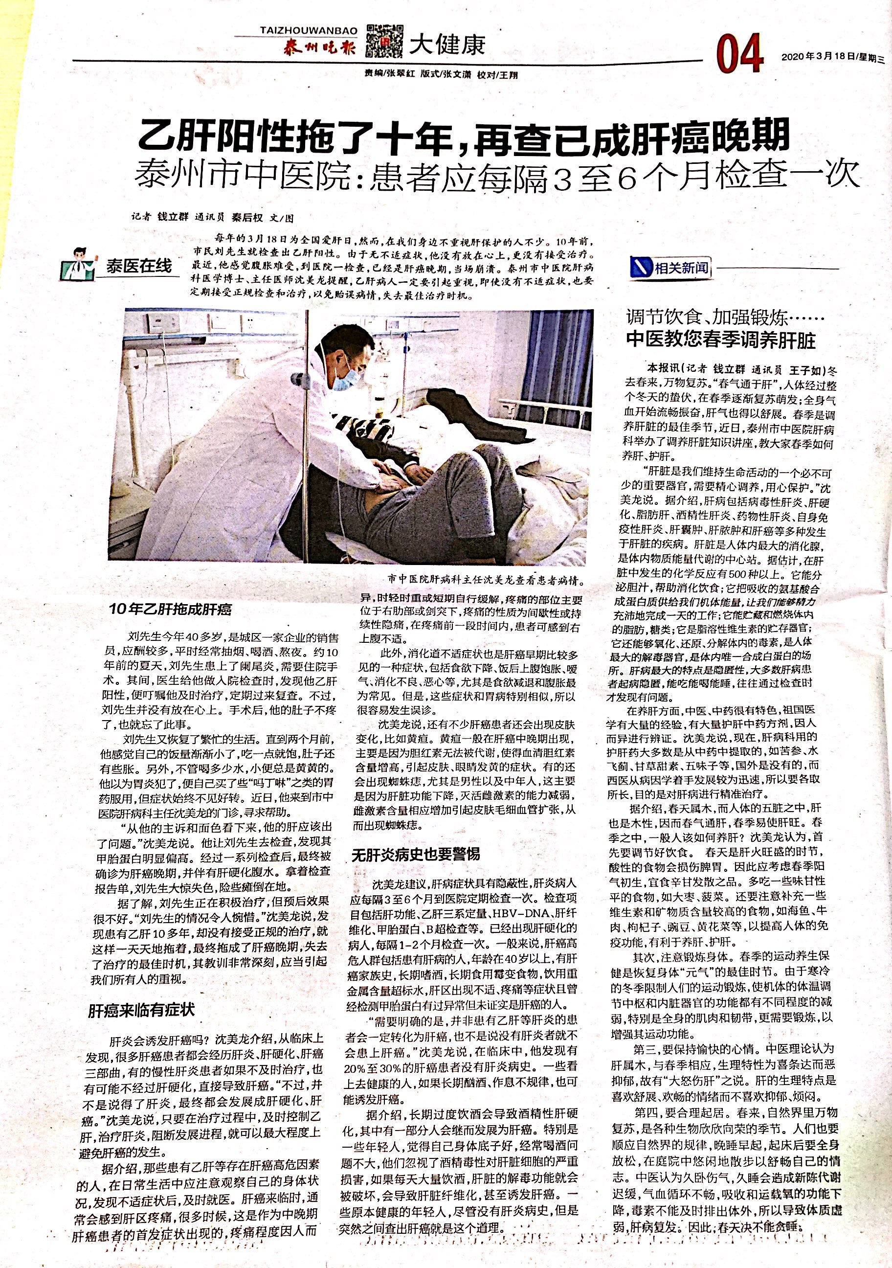【泰州晚報(bào)3月18日】乙肝陽性拖了10年,再查已成肝癌晚期 泰州市中醫(yī)院:患者因每隔3-6個(gè)月查一次