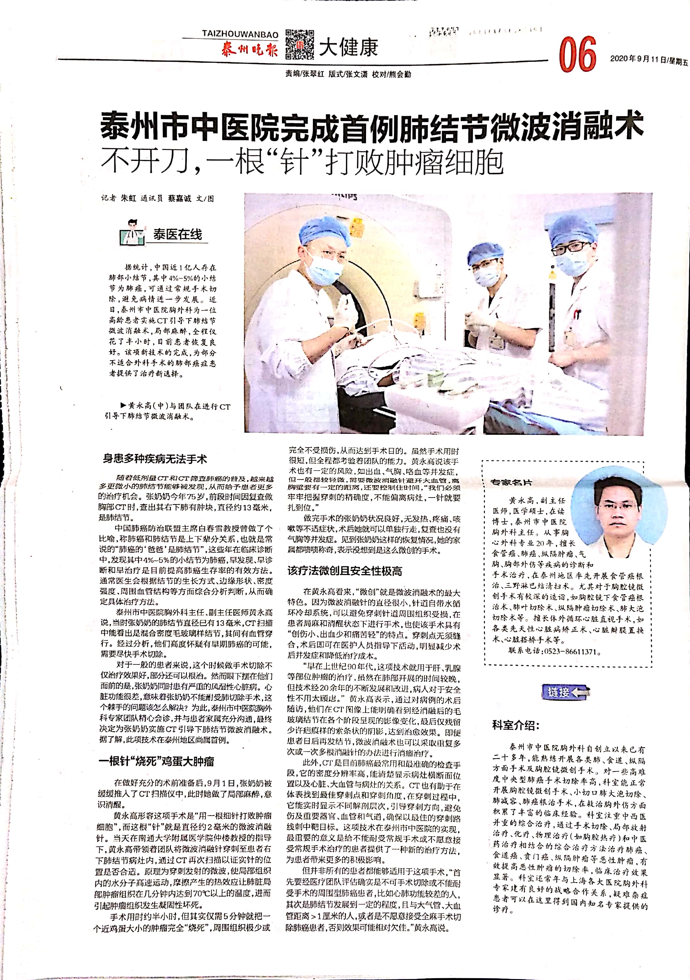 【泰州晚報9月11日】泰州市中醫(yī)院完成首例肺結(jié)節(jié)微波消融術(shù)-不開刀,一根“針”打敗腫瘤細(xì)胞