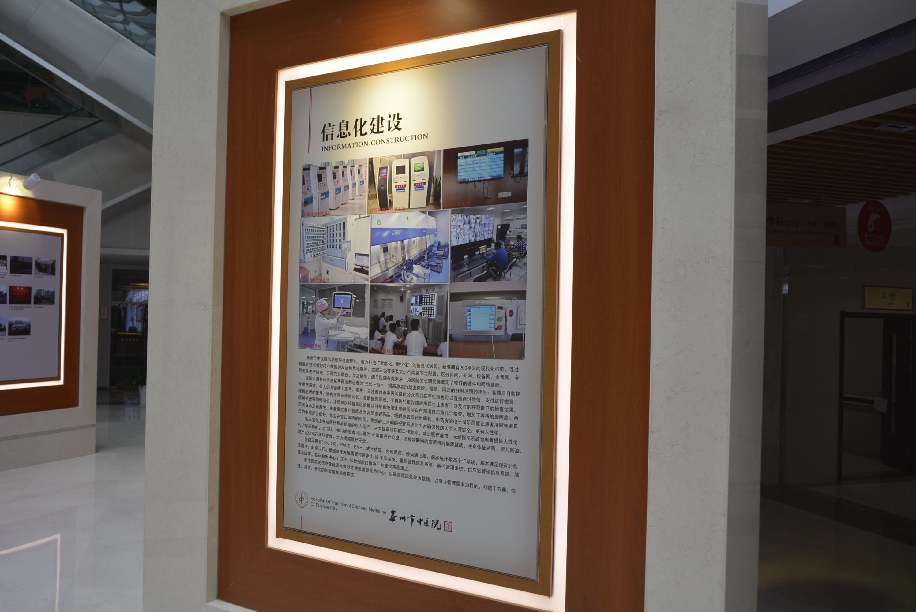 中醫(yī)藥傳統(tǒng)文化展示區(qū)集中展示了中醫(yī)傳統(tǒng)診療技藝,如望聞問切、針灸砭藥,同時設(shè)有中藥材標(biāo)本、中藥飲片、中醫(yī)藥傳統(tǒng)器皿(膏方罐、葫蘆藥瓶、酒瓶、香薰盒等)、中醫(yī)藥古書籍展示區(qū),集中展示標(biāo)本近上百種,還有許多院內(nèi)制劑和養(yǎng)生保健產(chǎn)品,通過實物和文字介紹,可以看到中藥材的藥用部位特性、了解中藥材如何真?zhèn)伪鎰e。中醫(yī)藥養(yǎng)生展示區(qū)集中展示四季養(yǎng)生、八段錦、五禽戲與“六養(yǎng)”即養(yǎng)志、養(yǎng)德、養(yǎng)眼、藥養(yǎng)、養(yǎng)行、養(yǎng)神。中醫(yī)名人典故展示區(qū)集中展示了歷代中醫(yī)藥名醫(yī)、泰州八大名醫(yī),并以浮雕的形式展示了神農(nóng)嘗百草、時珍問藥、扁鵲診脈、雷公炮灸、思邈傳道、仲景著書、懸壺濟世、橘井泉香等中醫(yī)藥典故。